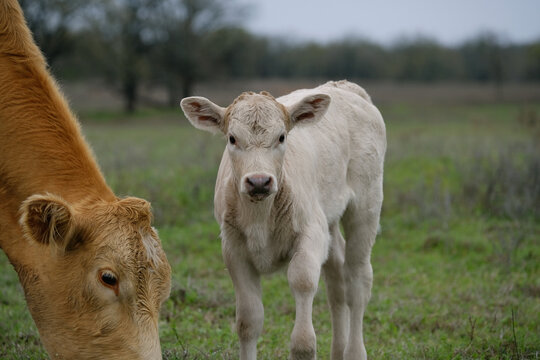Charolais calf with cow shows beef cattle in Texas field during spring season on ranch.