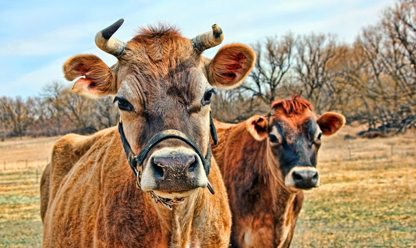 two cows looking at the camera in the cow pen against the background of the cow shed