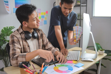 Two Young Asian Male Designers Working Together, Discussing Color Choices