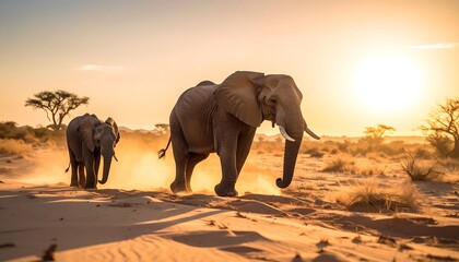 Two large elephants walk across a sandy desert landscape as the sun sets, casting a golden glow. Another elephant is behind