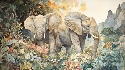 Two Elephants Amidst Lush Tropical Flora and Mountains
