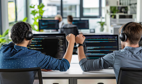 Two programmers wearing headphones fist bumping in front of their computer screens, symbolizing teamwork and collaboration in a modern office environment