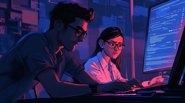 Tech Titans: Two skilled programmers collaborate intently, their faces illuminated by the glow of a computer screen displaying complex code. This image embodies the essence of teamwork.
