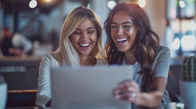 In a lively cafe filled with warm light, two friends burst into laughter while looking at a laptop, enjoying each other's company and the moment