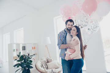 Portrait of dreamy cute couple bonding with close eyes holding air balloons and packed gift box case, celebrating valentine day, 14-february, standing in modern white apartment with interior