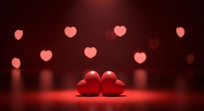 Two red heart shaped objects in a romantic spotlight with bokeh hearts