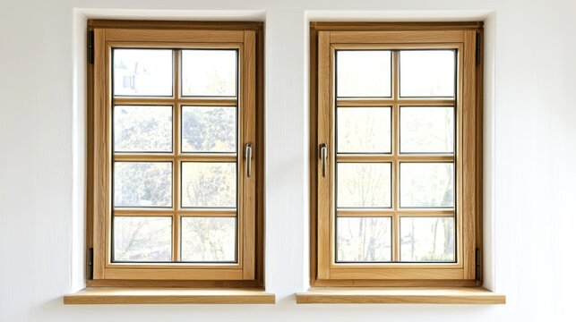 Group of two wooden windows with light brown finish and simple trim on white background.