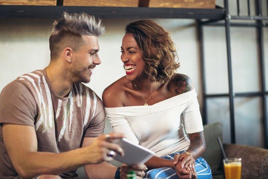 Two happy mixed race couple having fun at the coffee shop using digital tablet