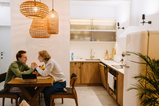 Cheerful gay couple relaxing with tablet in cozy bedroom