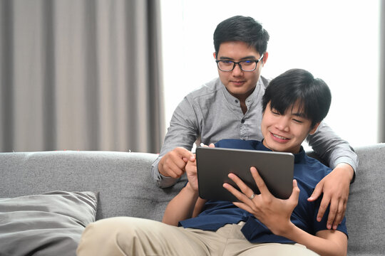Happy of homosexual couple embracing and using digital tablet together in living room. Homosexual, LGBT concept.