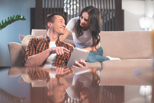Cheerful loving couple is using internet at home. Guy is pointing at portable computer and laughing. Girl is sitting on sofa with relaxation