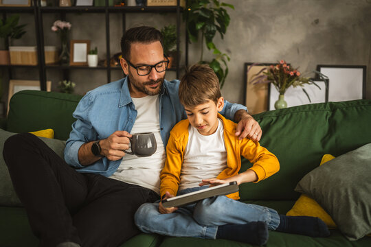 Happy gay couple using digital tablet while spending time together at home. Homosexual, LGBT concept.