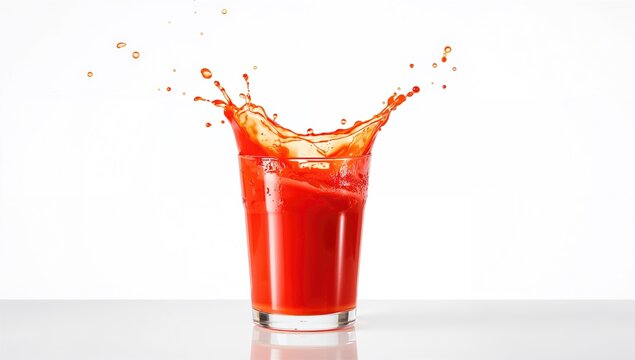 Tomato juice splashing out of a glass against a white background