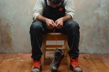 Worker sitting on a wooden stool tying a worn work boot with bright orange laces, rolled sleeves and rugged clothes, hands focused and weary in a simple workshop