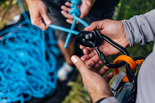 A long rope in the background, focuses on the two male persons, holding hooks, and tying them with a rope.