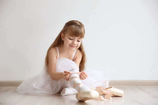 Beautiful little ballet dancer tying pointe shoes in light dance studio