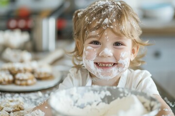 Adorable child baking and covered in flour, smiling joyfully in a cozy kitchen setting, creating happy and messy memories.