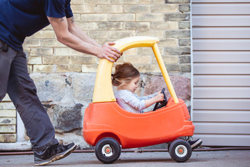 Portrait of a toddler girl being pushed by her daddy in a outdoor toy car