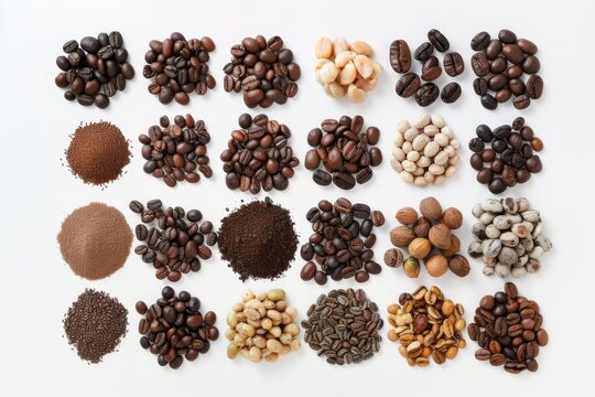 A mix of diverse beans and nuts displayed together, A collection of different coffee beans from around the world