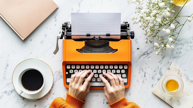 A person's hands typing on an orange typewriter with a cup of coffee, a notebook, and flowers on a white marble surface.