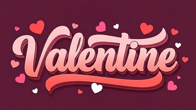 Retro script typography spelling valentine surrounded by floating hearts in shades of pink and red against a deep maroon background for holiday graphics