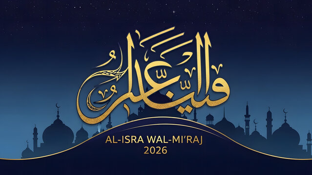 Celebrating Al-Isra Wal-Mi'raj with Islamic Calligraphy and Mosque Silhouettes at Night
