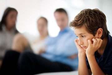 Boy sitting apart from his family on a sofa.