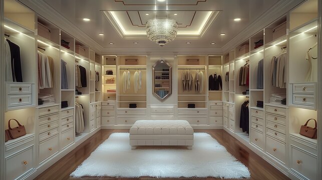 Walk-In Closet with Panel cabinets. Large room. U-Shaped closet. Spotlights in the closet. Generative AI.
