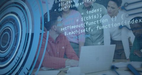 Team collaborating on ui mockups with futuristic holographic overlays