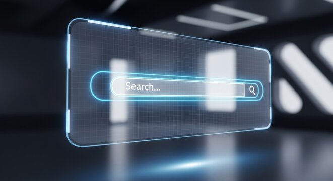 Holographic search bar interface floats in a dark futuristic setting.