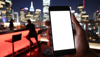 Hand holding smartphone mockup rooftop night lights
