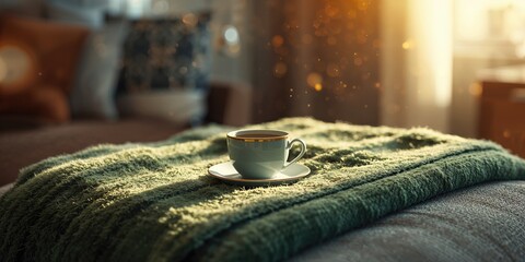 Tea served in a cup resting on a green blanket, suitable for UI backdrop or editorial header backgrounds