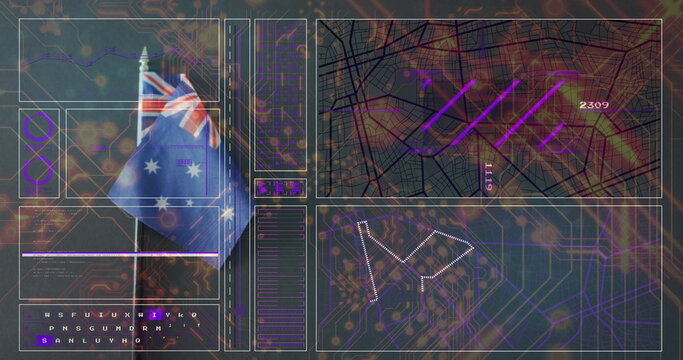 Displaying Australian flag hologram on console with circuit traces, map and data panels, copy space