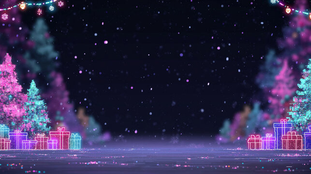 Digital gaming-style Christmas background featuring pixelated props, neon lights, and a fantasy RPG intro layout screen. Cinematic fantasy RPG Christmas intro background with pixel art decorneon glow.
