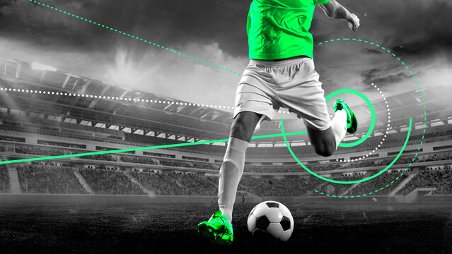 Footballer strikes ball with power under night lights with glowing cyan jersey and sci-fi UI tracking graphic overlays. Modern artwork. Concept of professional sport, celebration, games, events