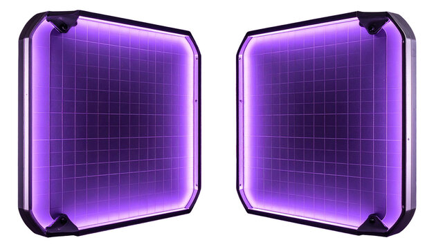 Two futuristic purple panels with grid screens and corner accents on black