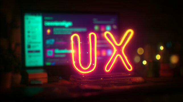 glowing ux letters made of illuminated wire on designer desk — creative concept image for use in user experience design blogs, digital agency websites, app development presentations, or tech startup