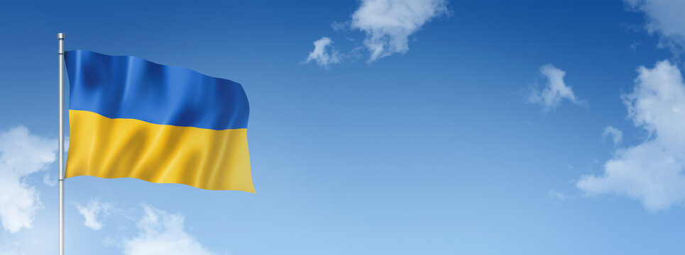 Ukrainian flag isolated on a blue sky. Horizontal banner