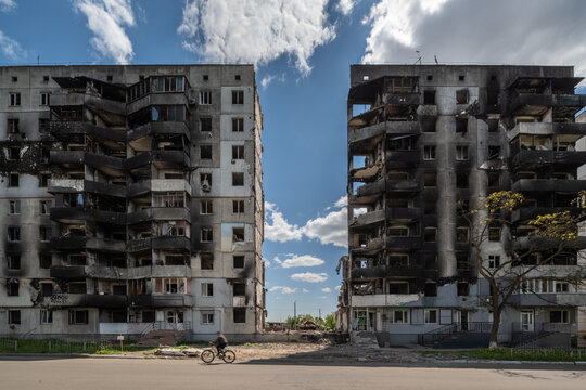 Russia war damage building destruction city war ruins city damage car. Terror attack bomb shell of civilian bombed. Disaster area. 2022 Russian invasion of Ukraine war torn city destroyed car burn out