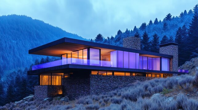 A modern mountain home with frosted lavender glass windows and smooth obsidian stone accents