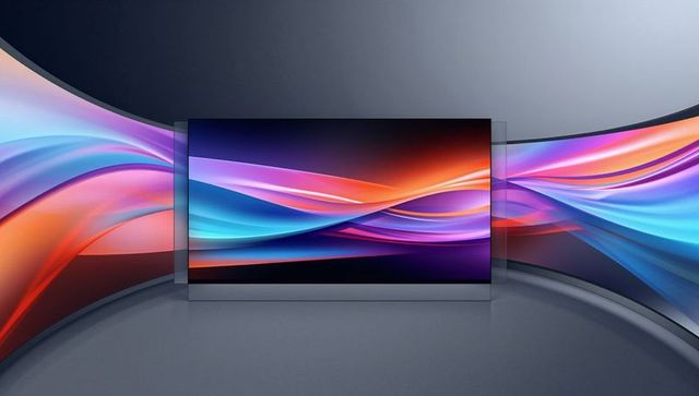 Curved glass display showing vibrant abstract wave gradient in modern tech showroom