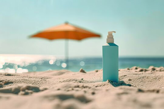 Sunscreen tube mockup on sand beach with parasols blurred background.