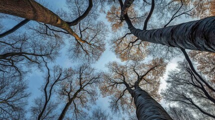 Aerial view of tall trees with leafless branches against a cloudy sky in a serene forest setting during autumn season.