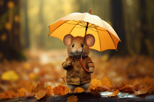 Family enjoying rainy day walk with colorful umbrellas in autumn park
