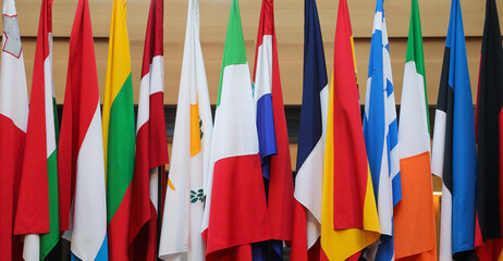 Many world's countries national flags waving on the wind, with UN, EU, GCC, Sweden, Serbian banners in the foreground, Doha, Qatar