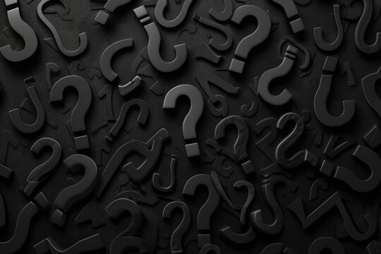 Black question marks scattered on a black surface. Suitable for illustrating uncertainty and unanswered questions.