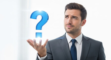 Confused businessman looks at question mark above hand, showing uncertainty. Question mark hovers as symbol of unanswered questions. Use this image for themes of uncertainty, confusion,