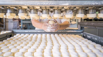 Baker skillfully prepares fresh sesame-topped buns in kitchen