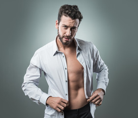 Male model revealing bare torso wearing beige button-down shirt, fashion portrait