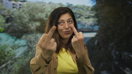 Woman flips middle finger in forest amid green trees while winking at camera, both middle fingers raised and in focus; defiance.